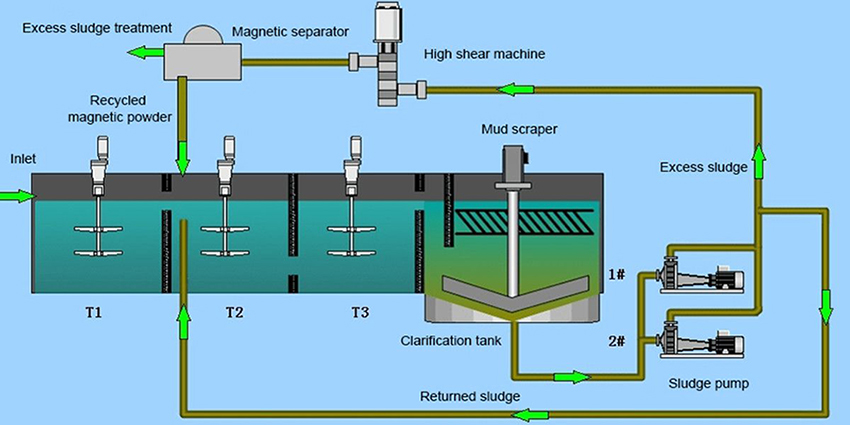 The magnetic coagulation and sedimentation technology is a method that involves adding magnetic powder simultaneously during the conventional coagulation and sedimentation process. This integration allows the magnetic powder to enhance the coagulation and flocculation effects, thereby achieving faster sedimentation of flocs. The entire system comprises various components, including a reaction tank, sedimentation tank, sludge system, magnetic powder recovery system, coagulant adding system, PAM system, and electrical control system.