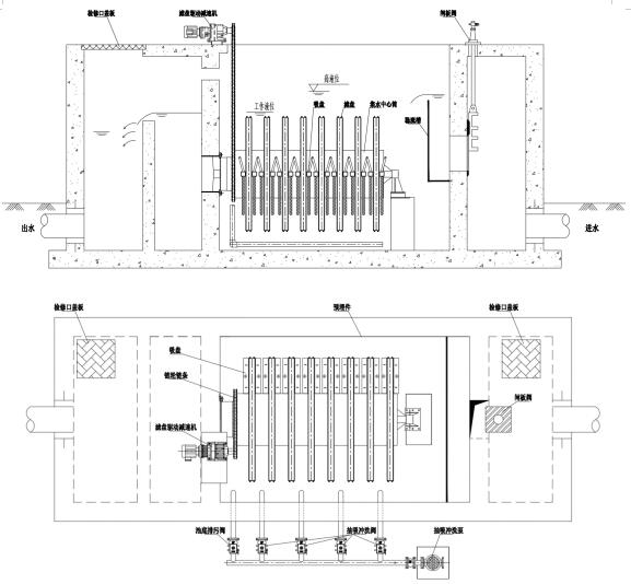 (3)排泥過程:濾布轉盤過濾器的濾盤下設有斗形池底,有利于池底污泥的收集。污泥池底沉積減少了濾布上的污泥量,可延長過濾時間,減少反洗水量。