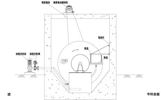 3、濾盤抽吸反洗機構 :由反洗吸盤、管道、反洗吸盤支架部件等組成。用于濾布的抽吸清洗。