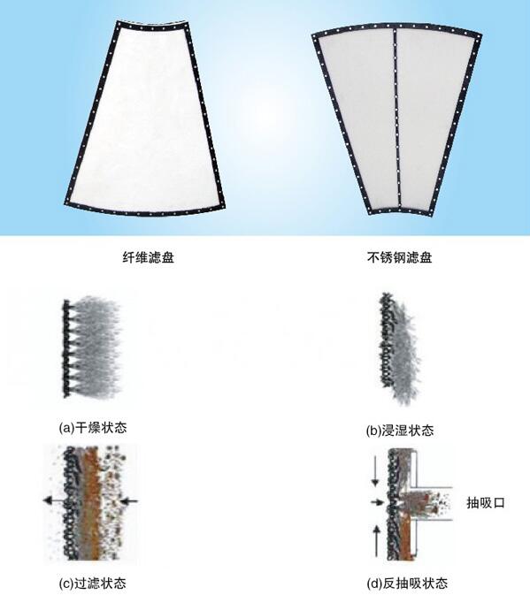 2、濾組盤:每個濾盤由3-12個獨立的扇形濾盤分片組成一個圓濾盤,圓形濾盤中間空心的,兩個上圓面覆蓋濾布,濾盤兩側為過濾面,中間空心部為清水區。濾毛的深度儲存俘獲的粒子,減少正常運行時的水頭損失。每個濾布濾盤至少有5.2m2、13m2的有效浸沒過濾面積,且容易從裝置上取出。
