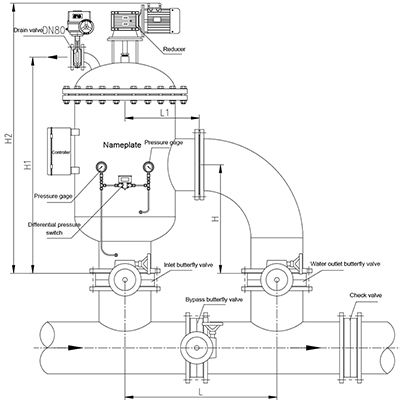 采用工業單片PLC自動控制,中文或英文顯示。可根據壓差或定時控制過濾器自動清洗,并可手動、強制清洗。現場可設定過濾時間、清洗時間。運行信號、清洗信號、故障信號輸出及485通訊接口。