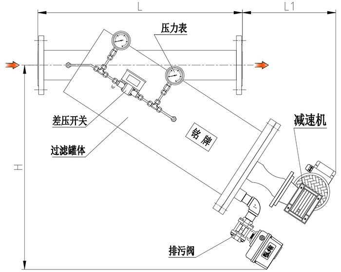S系列自清洗過濾器是一種全自動自清洗水過濾器,過濾器網筒內安裝一套刷子,刷子由電機帶動旋轉,在過濾器端蓋上安裝一個電動排污閥。工作時,濁水由進水口進入過濾器濾筒內,通過不銹鋼楔形網過濾污物。凈水由出水口流出,當污物在濾網表面聚集過多時,造成過濾出水不暢,濾筒內部腔體壓力上升,當進出水的壓力差值達到一定值時(預先設定),壓差開關發出信號給控制器,控制器啟動減速機電機帶動刷子,旋轉刷除濾網表面的污物雜質。同時打開電動排污閥排出污物,清洗時間為20-120秒(可就地可設置)。清洗時無需斷流,排污壓力損失不超過0.5bar,流量損失不超過1%。