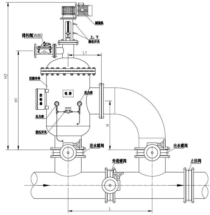 采用工業單片PLC自動控制,中文或英文。可根據壓差或定時控制過濾器自動清洗,并可手動、強制清洗。現場可設定過濾時間、清洗時間。運行信號、清洗信號、故障信號輸出及485通訊接口。