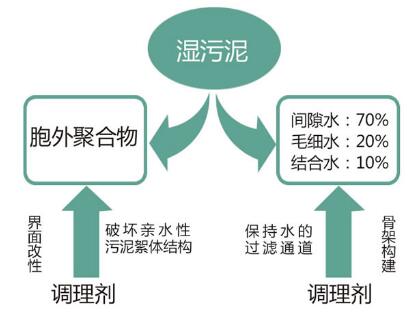 污泥改性調理主要是對污泥顆粒表面的有機物進行改性,破壞污泥的細胞和膠體結構,改變污泥的水分結合狀態,同時降低污泥的壓塑性,使污泥能滿足深度脫水干化處理的要求。